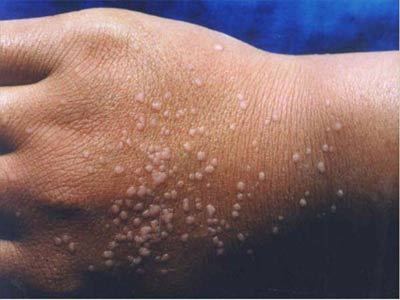 3、发病特点:扁平疣发病后症状常常表现为正常皮肤颜色或是浅褐色的扁平疣,常常表面比较光滑,境界也不明显,尤其是在疾病初发的时候,皮损质地和栗子相似,常常是呈现褐色的扁平丘疹,发病后的形状主要是圆形或是多角形,临床上皮疹的数目有时散开,还可能会密集分布,但是寻常型发病后初期是针尖大小的丘疹,手部慢慢的会扩展成豌豆大小甚至是更大的症状,表面粗糙,角化分明,质地也比较坚硬。