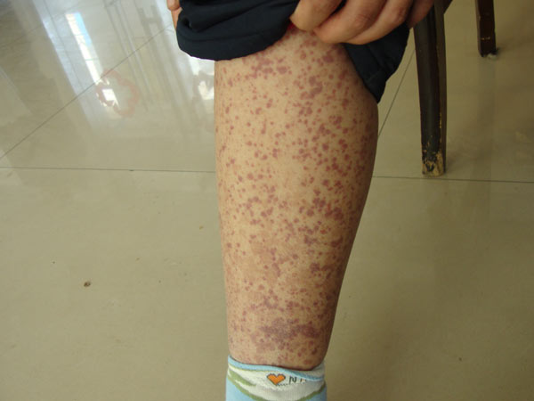 单纯型过敏性紫癜在发病后,患者皮肤出现针尖至黄豆大小的皮疹,分散开来,发展较快,一般可在一天之后发展为出血性皮损,而紫癜相会可融合成大片,往往分批的出现,皮损严重者会发展成为水疱或是溃疡,约经过2-3周左右消退。