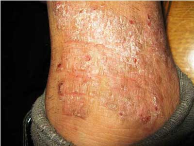 小腿湿疹:好发胫前及踝部到期,下肢或外伤引起的结壳的静脉曲张,增厚苔癣糜烂的水,易继发感染或难治性溃疡。