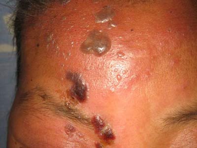 二、带状疱疹起初出现的时候,患者的脸部的皮肤会出现一些红斑,这些红斑的形状主要呈现成不规则或椭圆形,过段时间后这些红斑就会渐渐的变成水疱,然后会逐渐的增多,并且还会结合在一起形成一个大疱,严重的患者这水疱就会变成血疱,然后渐渐的被感染成脓疱,过段时间后,脓疱会渐渐消退,然后干瘪结痂,一二周后这些痂就会消退,但是一般不会留下任何疤痕。