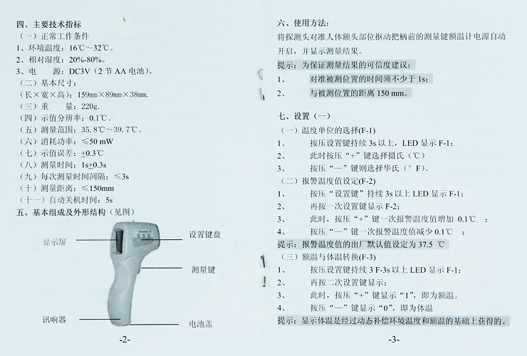 | 产品说明 | 【通用名称】红外体温监测仪 【生产企业】厦门天众达科技股份有限公司 【适用范围】额温型红外线体温计(以下简称体温计)一种利用红外接收原理测量人髓骼温的测量计。使用只需方便的将探测窗口对准额头位置,就能快速、准确的测得人骼温度。 |