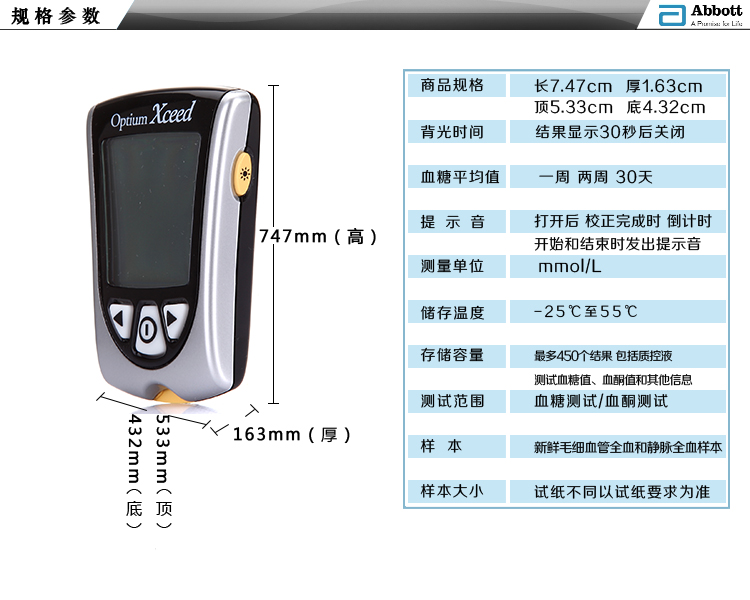 | 用途 | 该产品与FreeStyle Optium H血糖试纸和FreeStyle Optium H血酮试纸配套使用,用于测定新鲜全血中的血糖浓度和血酮(β-羟丁酸)浓度。 | |